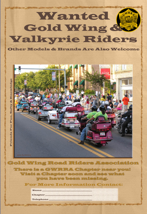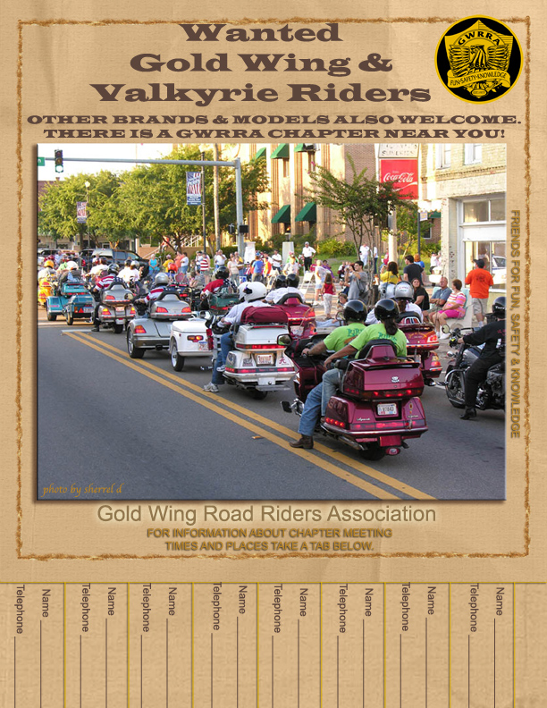 “Public relations” (PR) is defined in Webster’s New Collegiate Dictionary as being “the business of inducing the public to have an understanding for and goodwill toward a person, firm, or institution; also: the degree of understanding and goodwill achieved.” Webster’s New World Dictionary defines PR as “relations with the general public as through publicity; specifically those functions of a corporation, organization, etc. concerned with attempting to create favorable public opinion for itself.” We are excited about GWRRA here in Georgia, and want to spread that excitement. To help do that, we have created two types of posters you can use. One is a "Pull-Tab" flyer which can be printed on an 8-1/2" x 11" sheet of paper. This is great for small bulletin boards or doors. The other poster you can download and print is designed for 13" x 19" poster size. This is best if taken to a professional printer or to your local print shop such as Kinkos. These posters are great at dealerships and other places where you really want to catch the eye of passing motorcyclists. Please feel free to use these posters, but please make sure you always seek permission from the proper person before posting any GWRRA materials. Please let us know your ideas for Public Relations. Thanks,